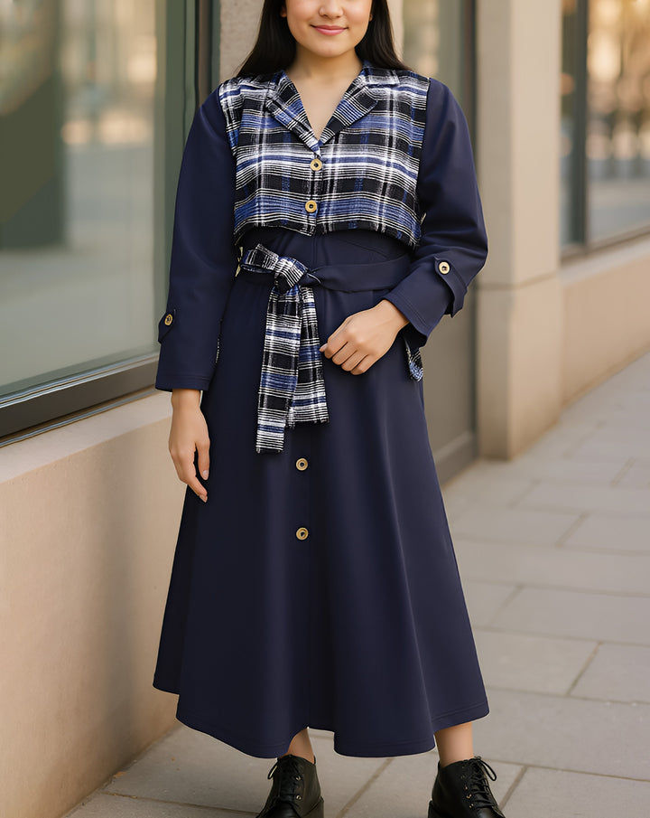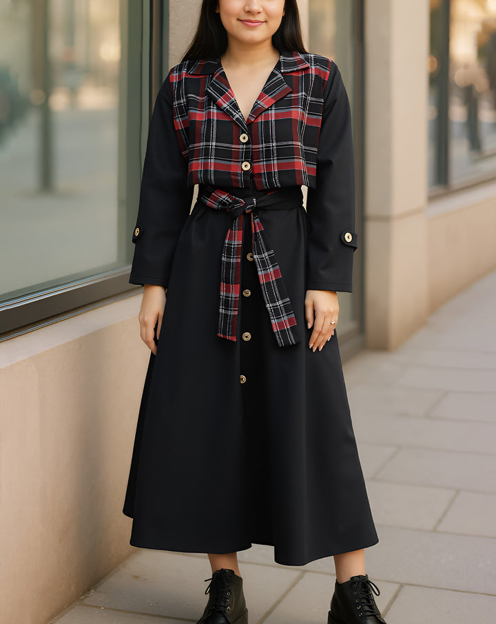 Women Maxi Giving The Look Of A Layered Crop Checkered Jacket Attached With The Gown