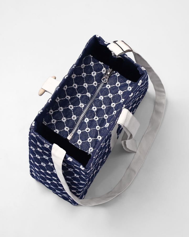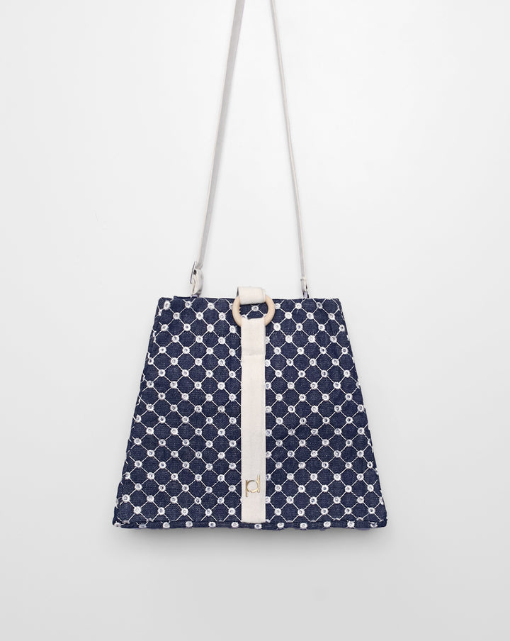 This Handbag Features A Stylish Navy Blue Denim Fabric With A Delicate White Embroidered Geometric Pattern