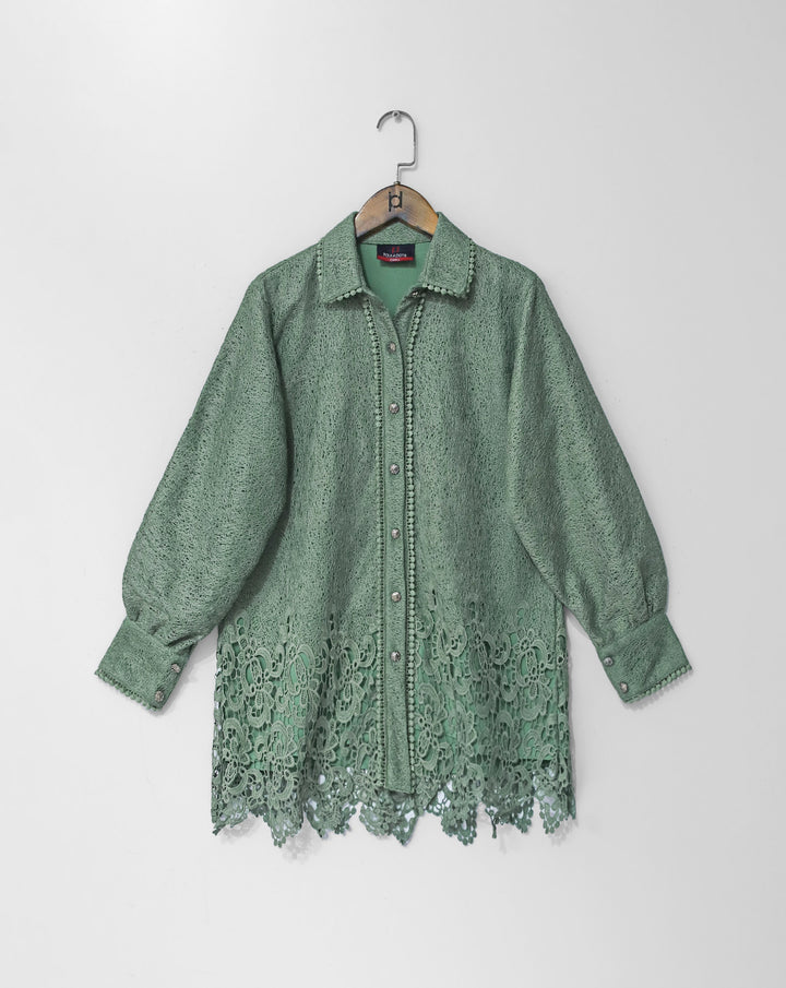 Women Button Down Shirt Features Lace Work On Collar And Placket
