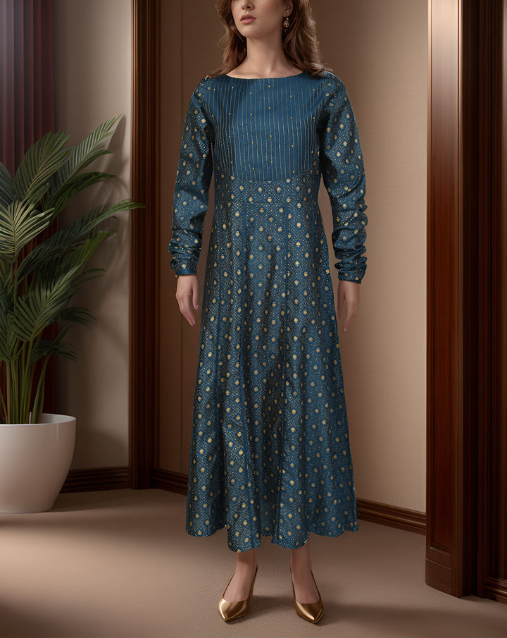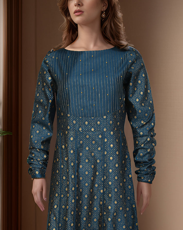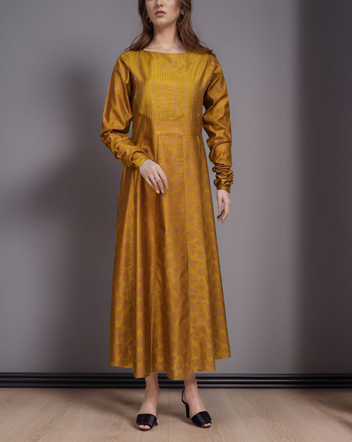 This Women Frock Features A Round Yoke On Front Which Is Adorned With Contrast Running Stitches