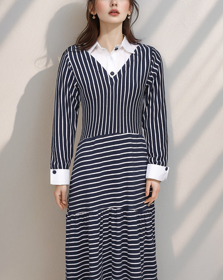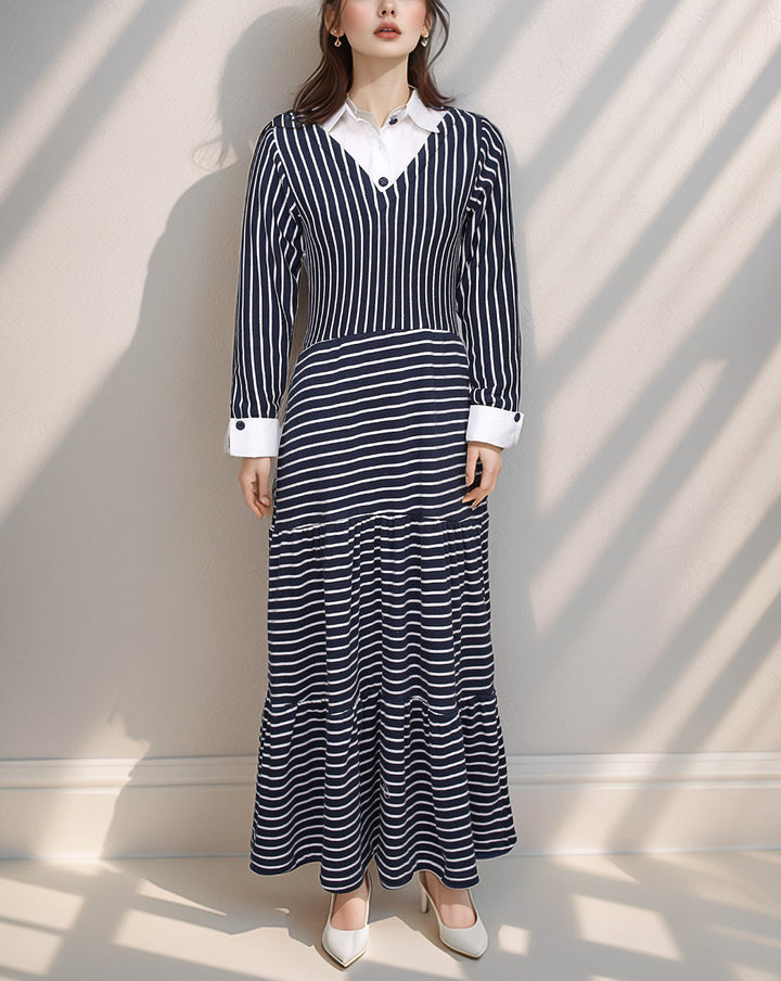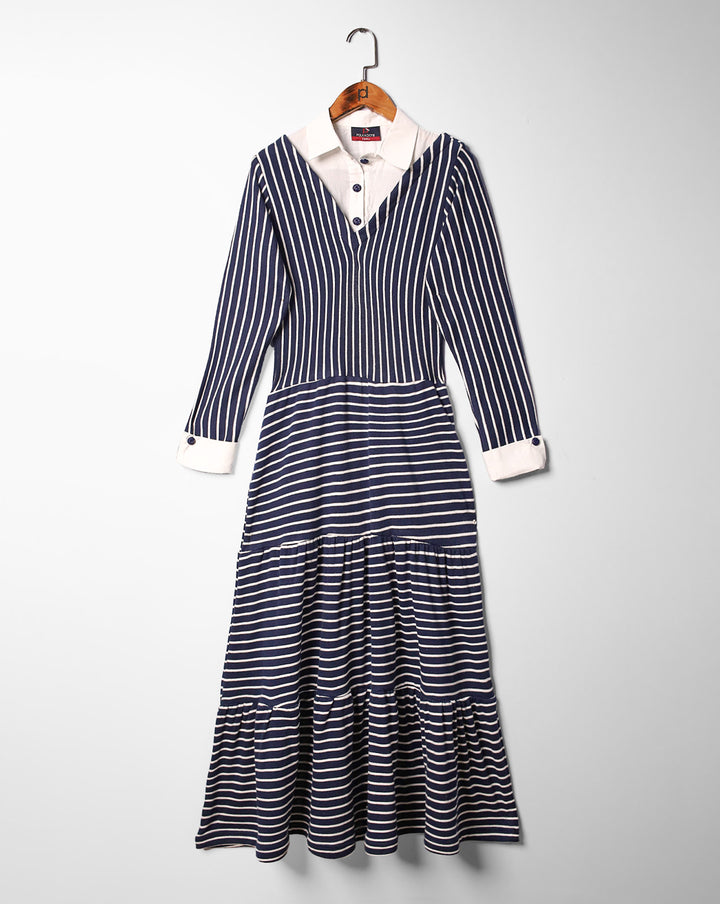 Linear Print Tiered Layered Dress Having A Look Of Button Down Shirt Collar